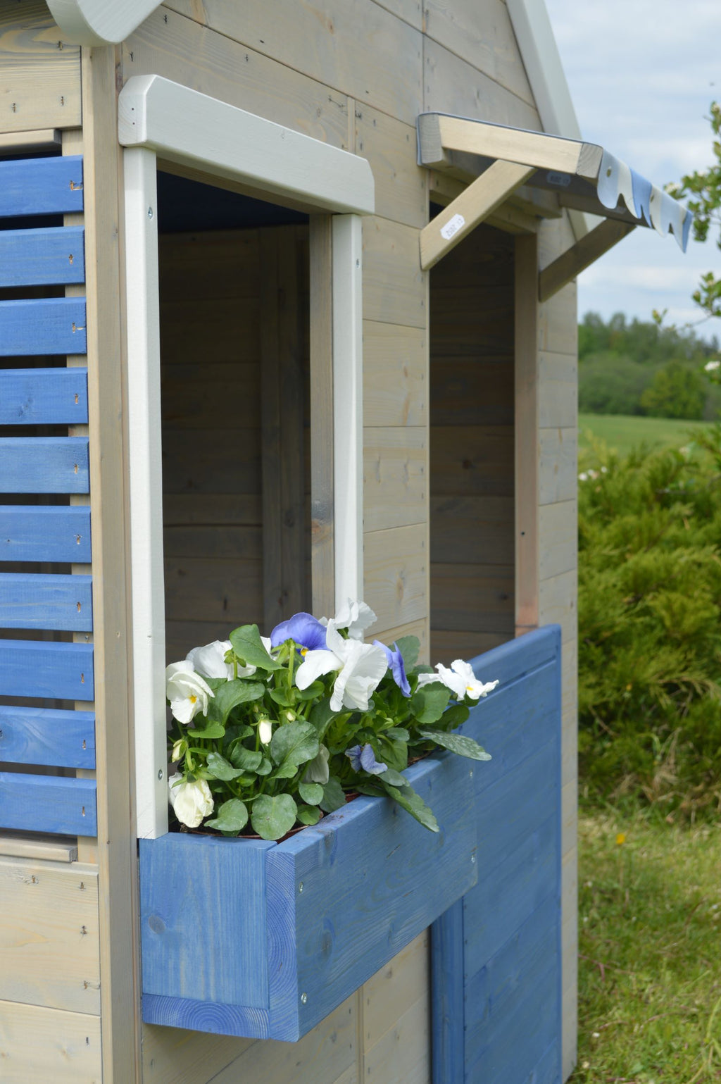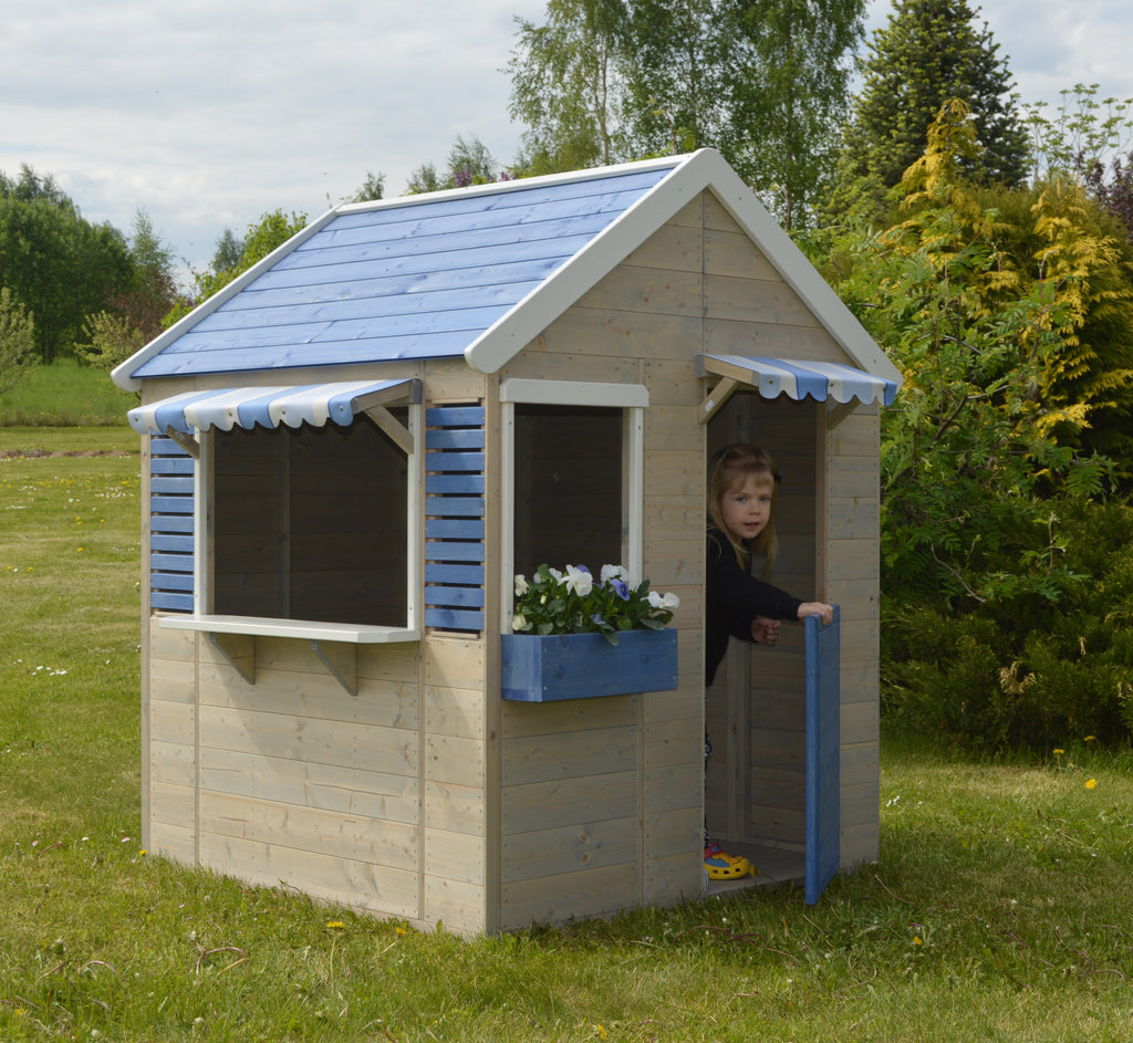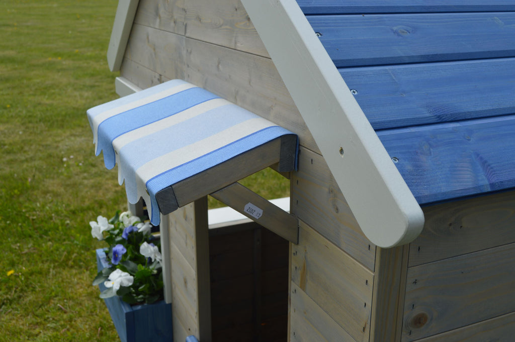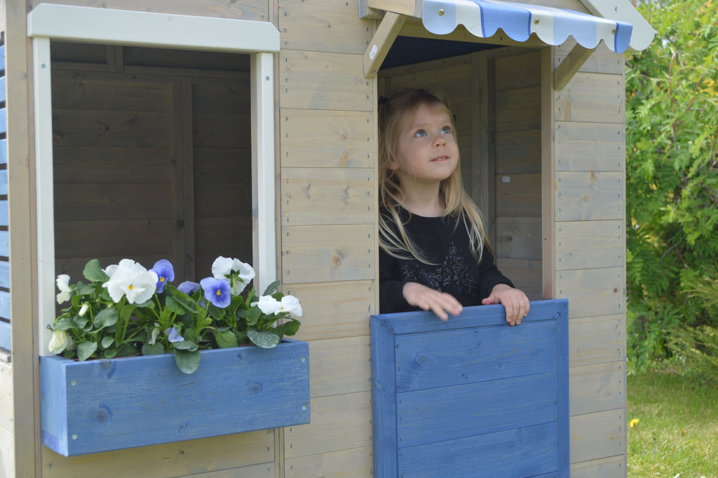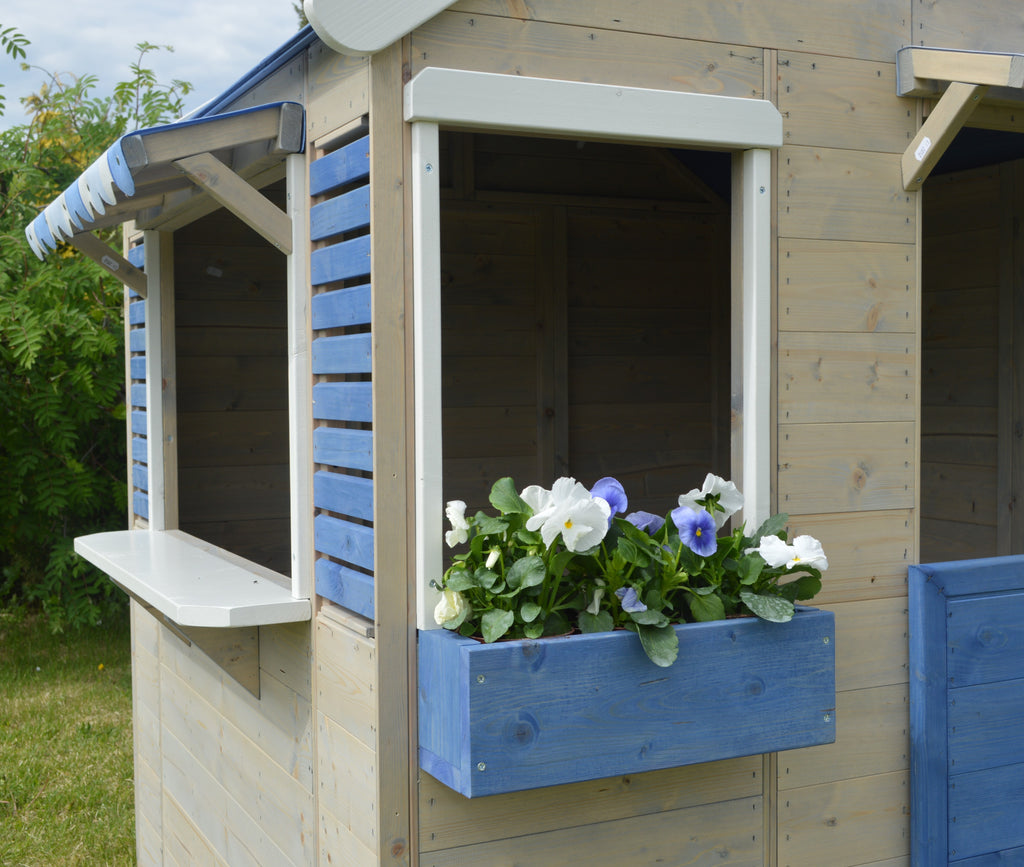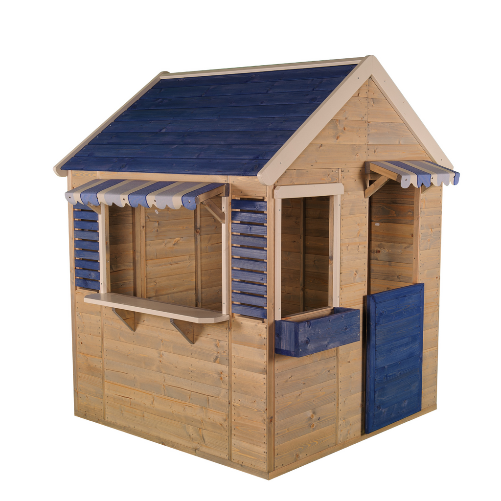 Featuring charming blue details and a spacious design, this playhouse is perfect for your child to invite their friends over for some garden playtime. With two windows that are complete with blinds and elegant awnings, your child's creativity can soar as they embark on imaginative adventures in the fresh air. Be it a kiosk, canteen, or even a theater backdrop, the possibilities are endless!