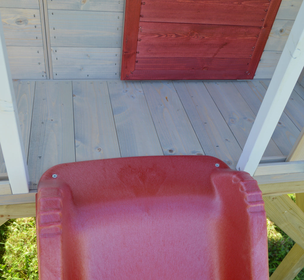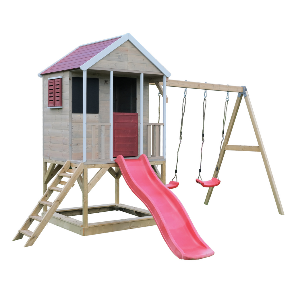 Built on a 90 cm high platform, this playhouse will keep your little ones active and engaged for hours on end. With a sandpit underneath, a blackboard for drawing, a functional window with shutters, a terrace, and a shelf, the Adventure Playhouse is packed with features that will make your child's playtime even more exciting! And if that's not enough, there's also an attached 175 cm long plastic slide and 200 cm high double seat swings on the side. Talk about an adrenaline rush!