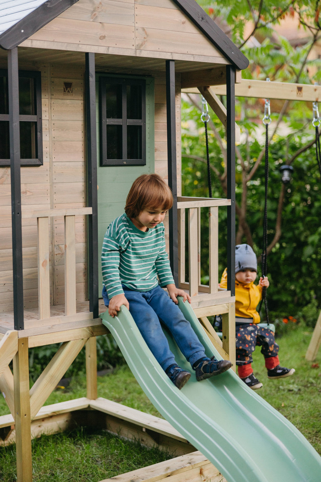 Built on a 90 cm high platform, this playhouse is designed to keep your child active and engaged. Underneath the platform is a sandpit, perfect for your little ones to build sandcastles and explore their creativity. In the front of the playhouse, there is an attached 175 cm long plastic slide, which is sure to provide hours of thrilling fun.