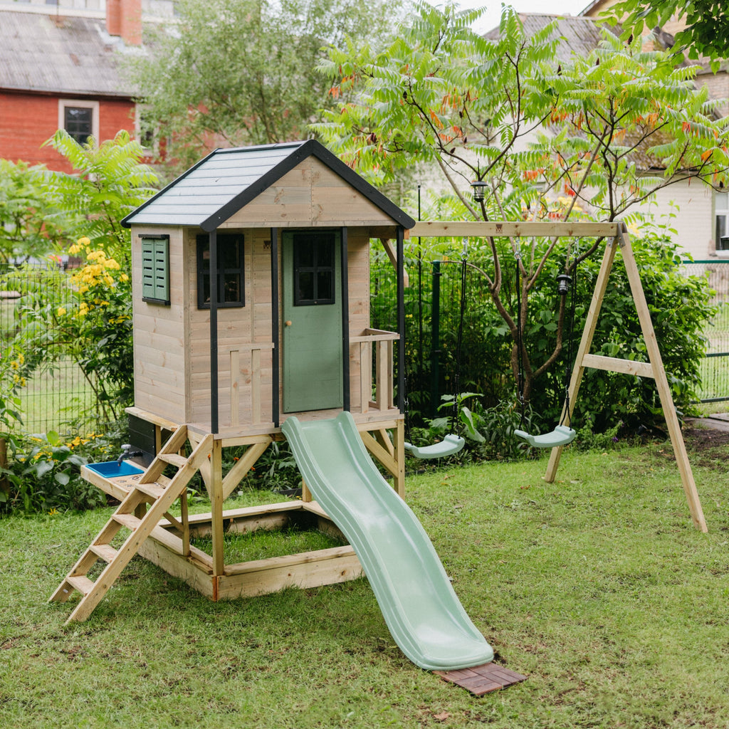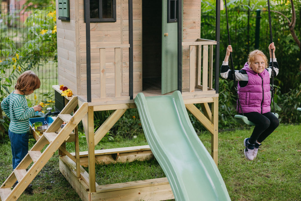 Built on a 90 cm high platform, this playhouse is designed to keep your child active and engaged. Underneath the platform is a sandpit, perfect for your little ones to build sandcastles and explore their creativity. In the front of the playhouse, there is an attached 175 cm long plastic slide, which is sure to provide hours of thrilling fun.