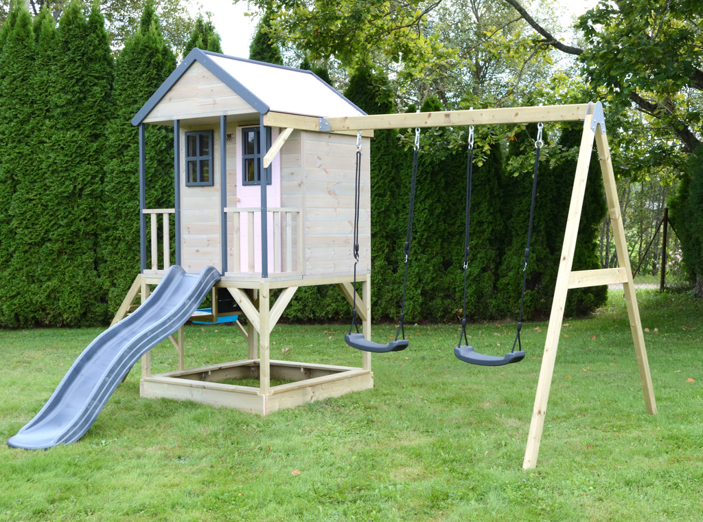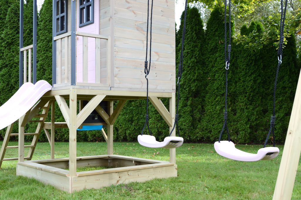 And that's not all - the attached double swings at the playhouse will allow children to clear their heads or feel the gusts of wind while swinging on a hot day. Additional safety will be provided by 4 pieces of metal ground anchors, which are attached to the legs of the swings and platform and driven into the ground.