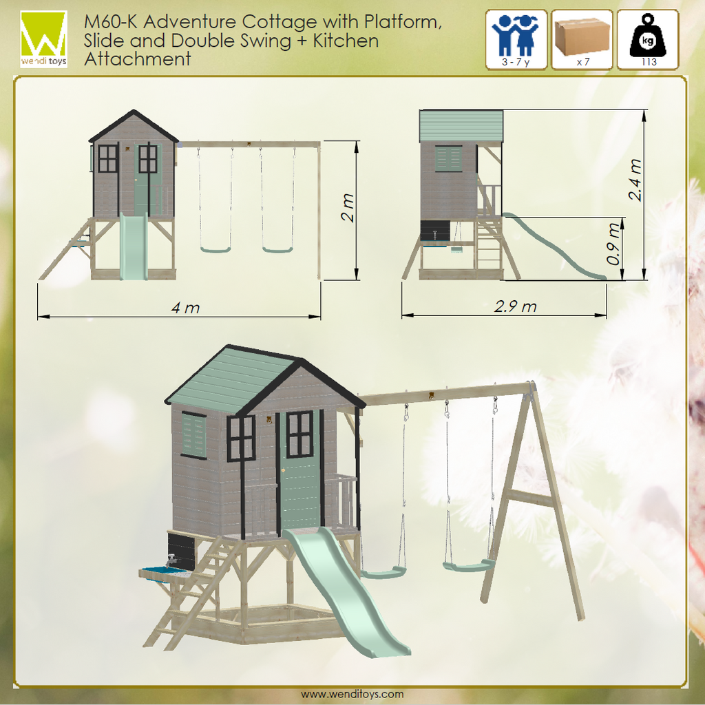 - Maintenance: Once in a year at the start of the season, examine the product carefully and check if all the parts are well secured, mounting screws are tightened and decorative screw caps are intact. Carefully check the parts of the structure to see if the plastic joints or wooden parts have any cracks in them that may affect the structural integrity. Renew the colouring of the wooden parts with child-safe paints.
